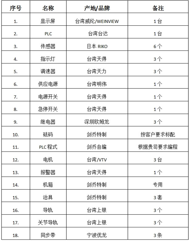 產(chǎn)品型號(hào):JQ-887 品牌:劍 喬 用途:一、本機(jī)概述; 本機(jī)機(jī)械結(jié)構(gòu):采用臺(tái)灣變頻調(diào)速電機(jī)凸輪結(jié)構(gòu)配合日本THK精密線性滑軌完成線性上下動(dòng)作,電器控制部分:采用臺(tái)灣威倫觸摸屏+臺(tái)灣臺(tái)達(dá)控制器(PLC).可對(duì)計(jì)算機(jī)、手