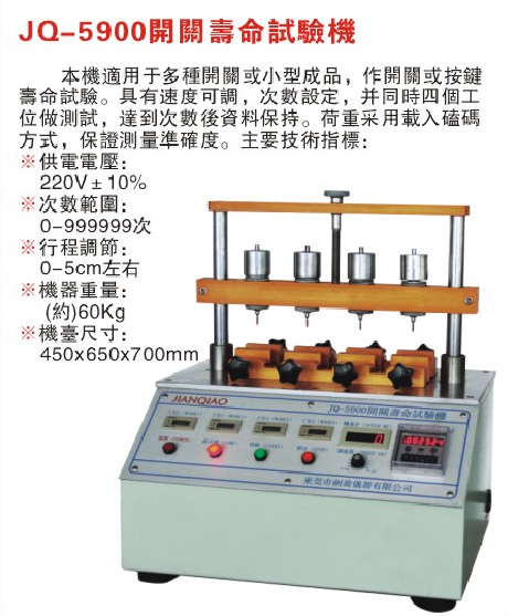 產(chǎn)品型號(hào):JQ-5900 品牌:劍 喬 用途:一、產(chǎn)品介紹: 本機(jī)可對(duì)計(jì)算機(jī)、手機(jī)、記事本等到鍵盤作壽命測試。適用于多種開關(guān)或小型成品,作開關(guān)或按鍵壽命試驗(yàn),具有速度可調(diào)、次數(shù)設(shè)定,并達(dá)到次數(shù)后數(shù)據(jù)保持. 二、主