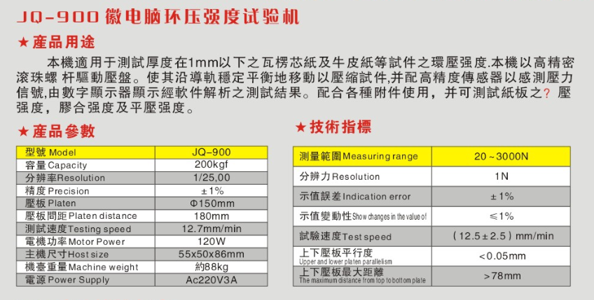 JQ-900 壓縮強度測試儀 紙品類環(huán)壓邊壓測試機 邊壓試驗機產(chǎn)品技術(shù)規(guī)格: