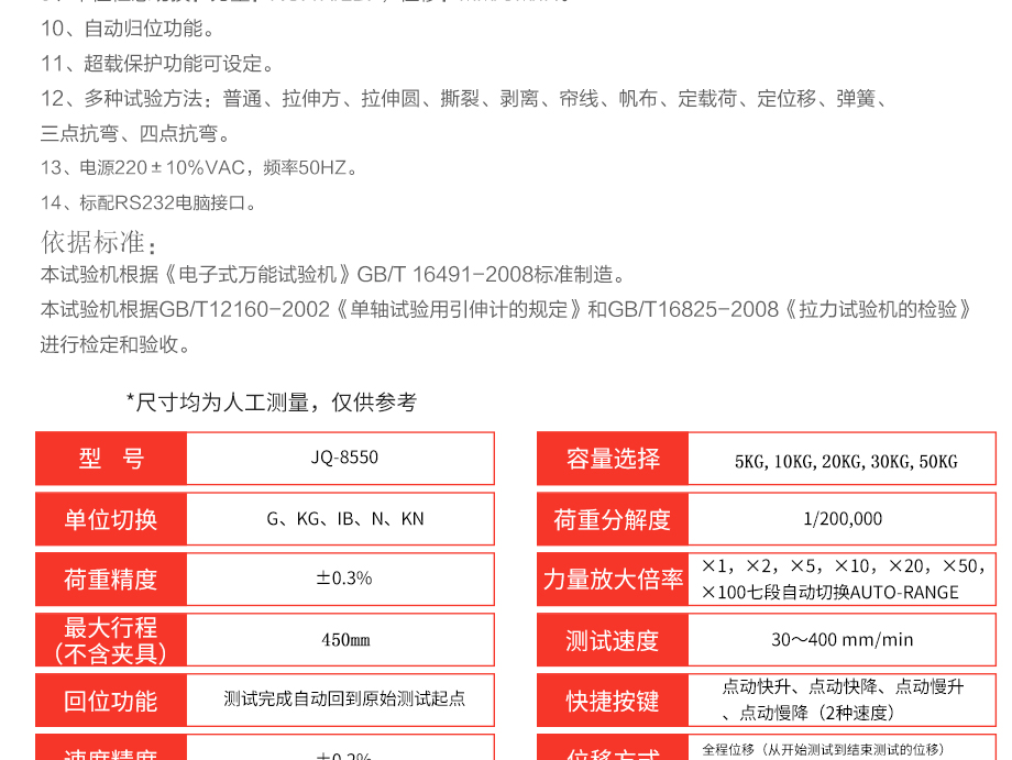 產(chǎn)品型號:JQ-8550 品牌:劍 喬 用途:本系列機(jī)廣泛用于各類薄膜、五金、橡膠料、紡織、建材、絕緣體、電線、電纜、端子等各類材料。測試其拉伸、撕裂、穿刺、剝離、抗壓、彎曲、抗剪切、定荷重、定位移、三點抗折