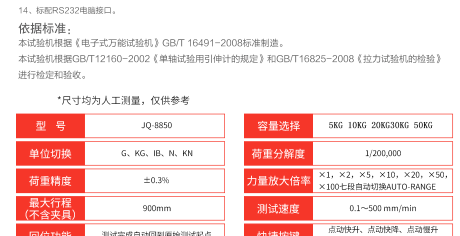 產(chǎn)品型號:JQ-8850 品牌:劍 喬 用途:本系列機廣泛用于各類薄膜、五金、橡膠料、紡織、建材、絕緣體、電線、電纜、端子等各類材料。測試其拉伸、撕裂、穿刺、剝離、抗壓、彎曲、抗剪切、定荷重、定位移、三點抗折