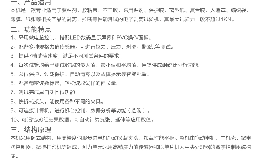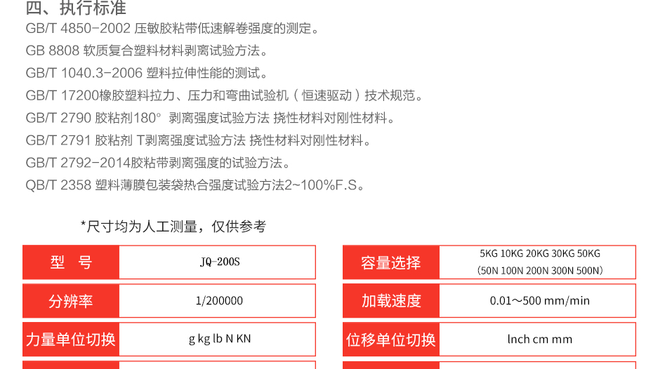 產(chǎn)品型號:JQ-200S 品牌:劍 喬 用途:本機是一款專業(yè)適用于膠粘劑、膠粘帶、不干膠、醫(yī)用貼劑、保護膜、離型紙、復合膜、人造革、編織袋、薄膜、紙張等相關(guān)產(chǎn)品的剝離、拉斷等性能測試的電子剝離試驗機,其最大試